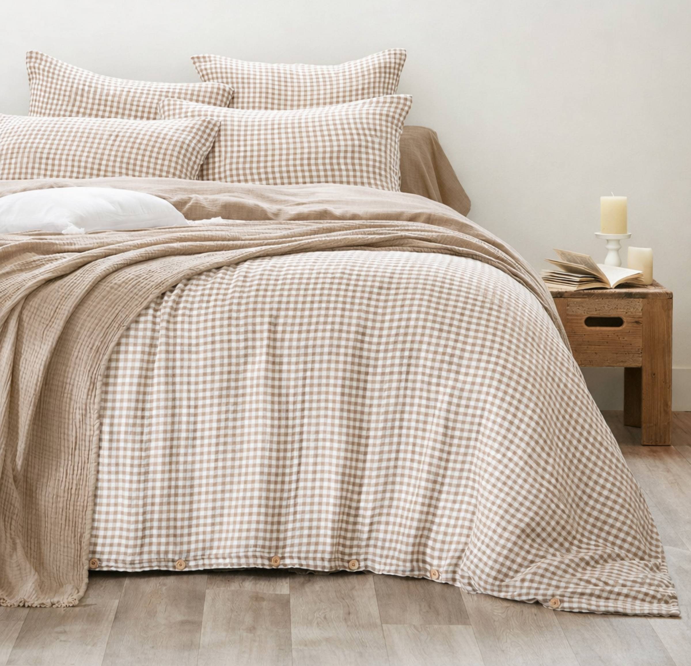 Da dieser Bettbezug aus Baumwoll-Gaze von Natur aus strukturiert ist, ist kein Bügeln erforderlich. Wir empfehlen jedoch, ihn vor dem ersten Gebrauch auf links zu waschen.