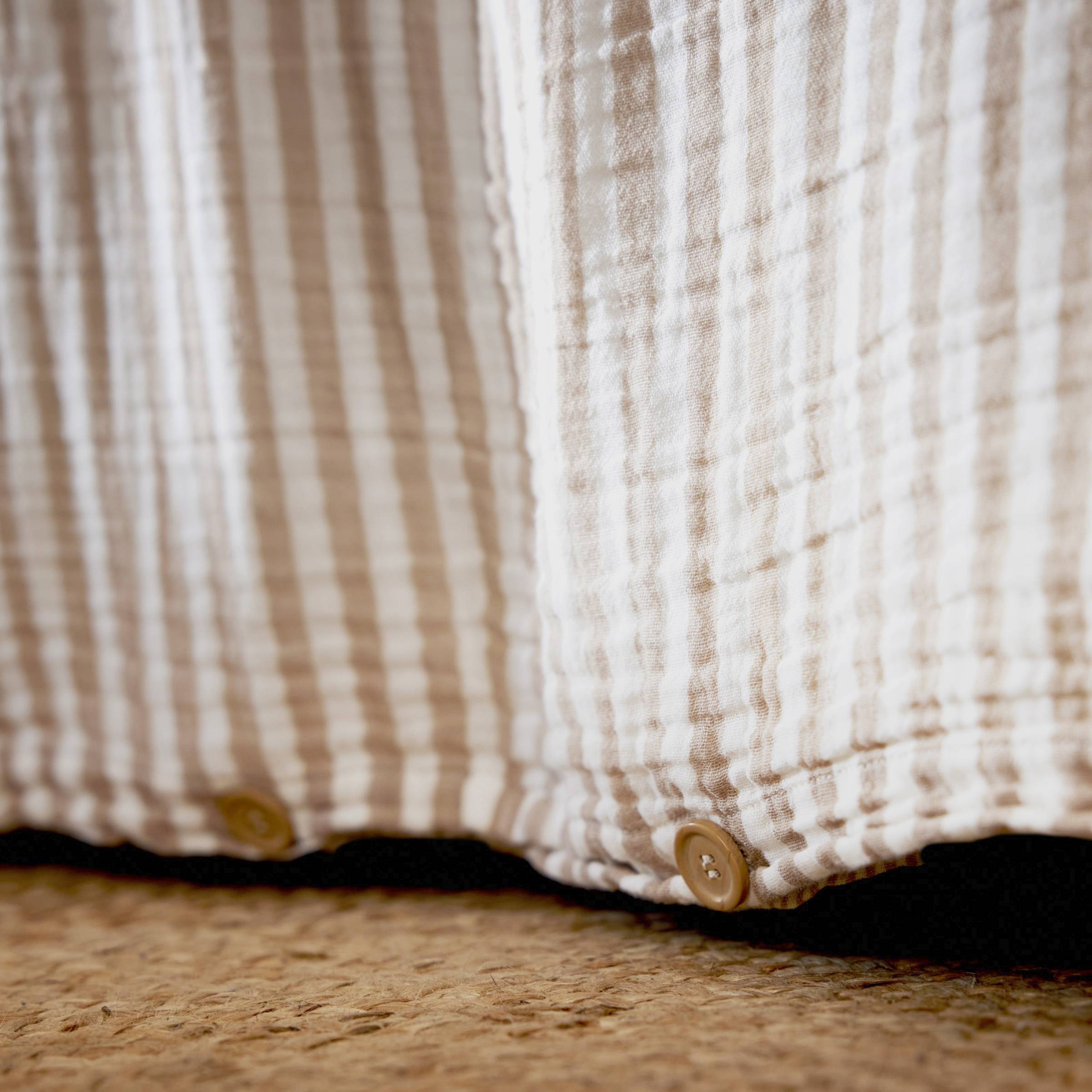Der Bettbezug Gaïa Streifen verbindet Authentizität und Weichheit. Hergestellt aus doppelt gewebter und gefärbter Baumwollgaze, bietet er ein leichtes und luftiges Gefühl, perfekt um Ihr Bett in eine warme und gemütliche Atmosphäre zu hüllen. Seine naturfarbenen Streifen verleihen Ihrem Schlafzimmer eine elegante und raffinierte Note, während die Qualität der Fasern eine dauerhafte Haltbarkeit gewährleistet.