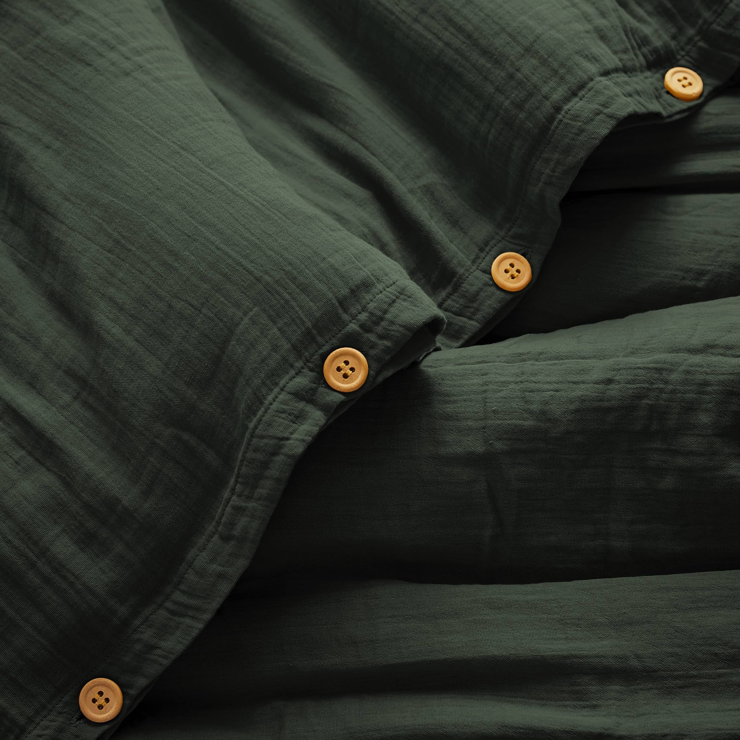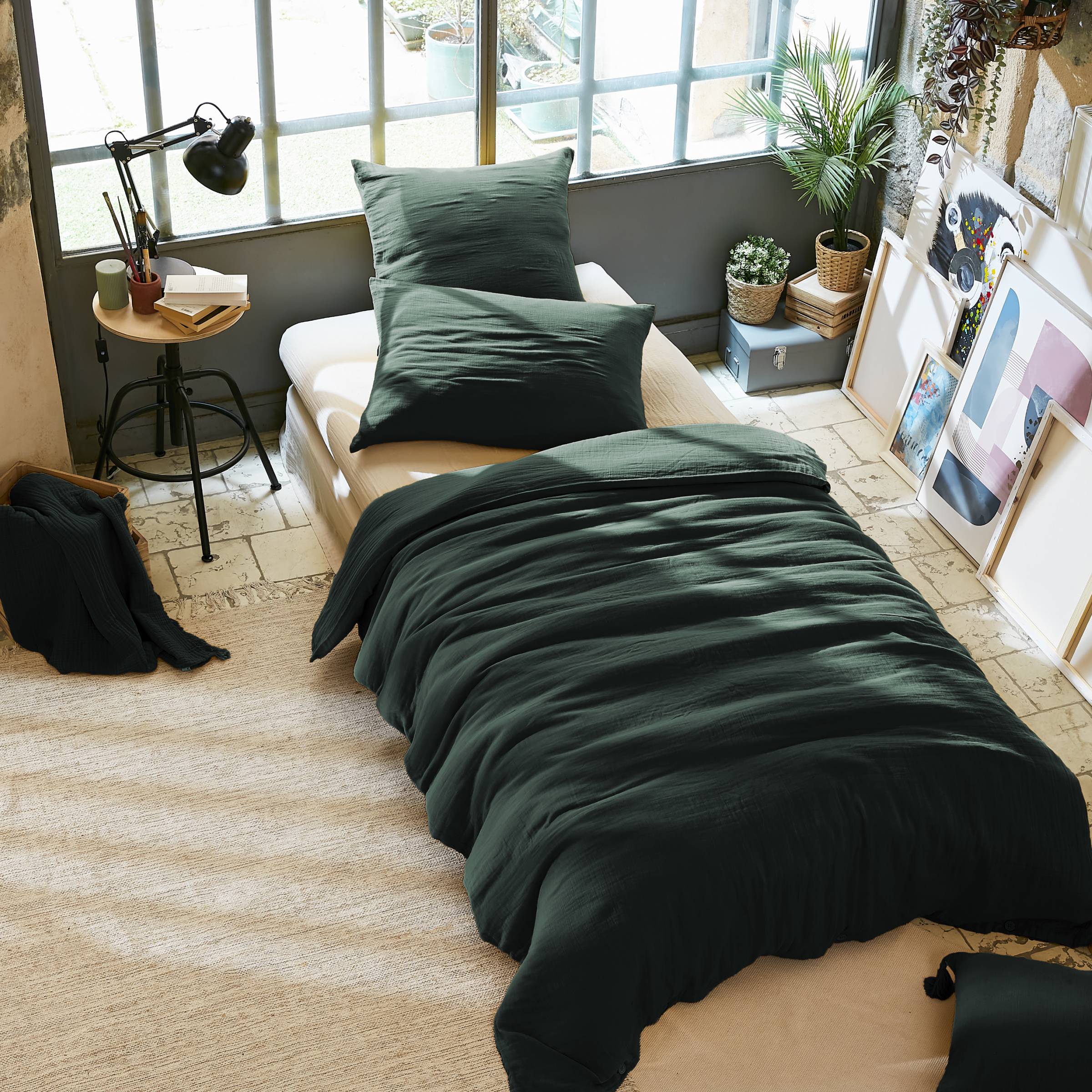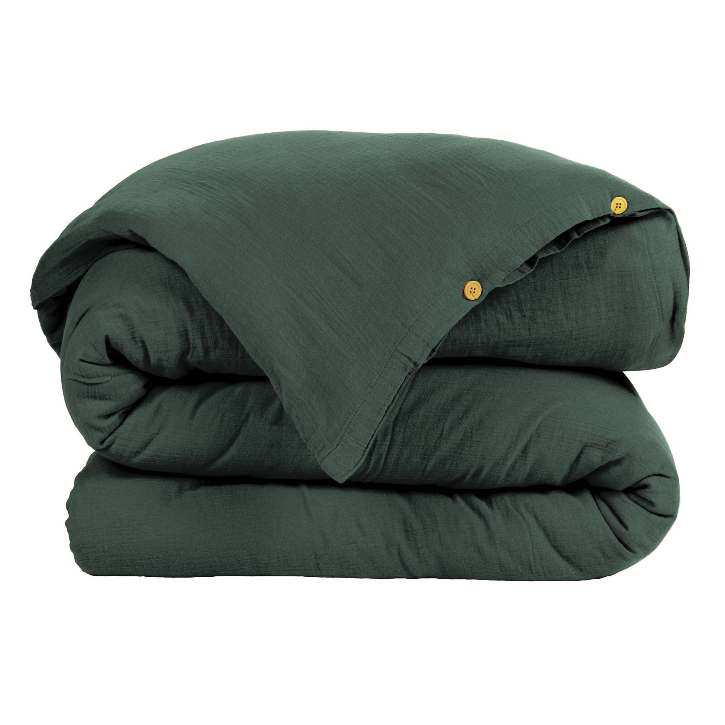 Dieser Gaïa Bettbezug aus Musselin bringt mit seiner Tannengrün-Farbe einen Hauch von Natur in Ihr Schlafzimmer. Sein weicher und leichter Stoff schafft eine beruhigende Atmosphäre für einen erholsamen Schlaf.