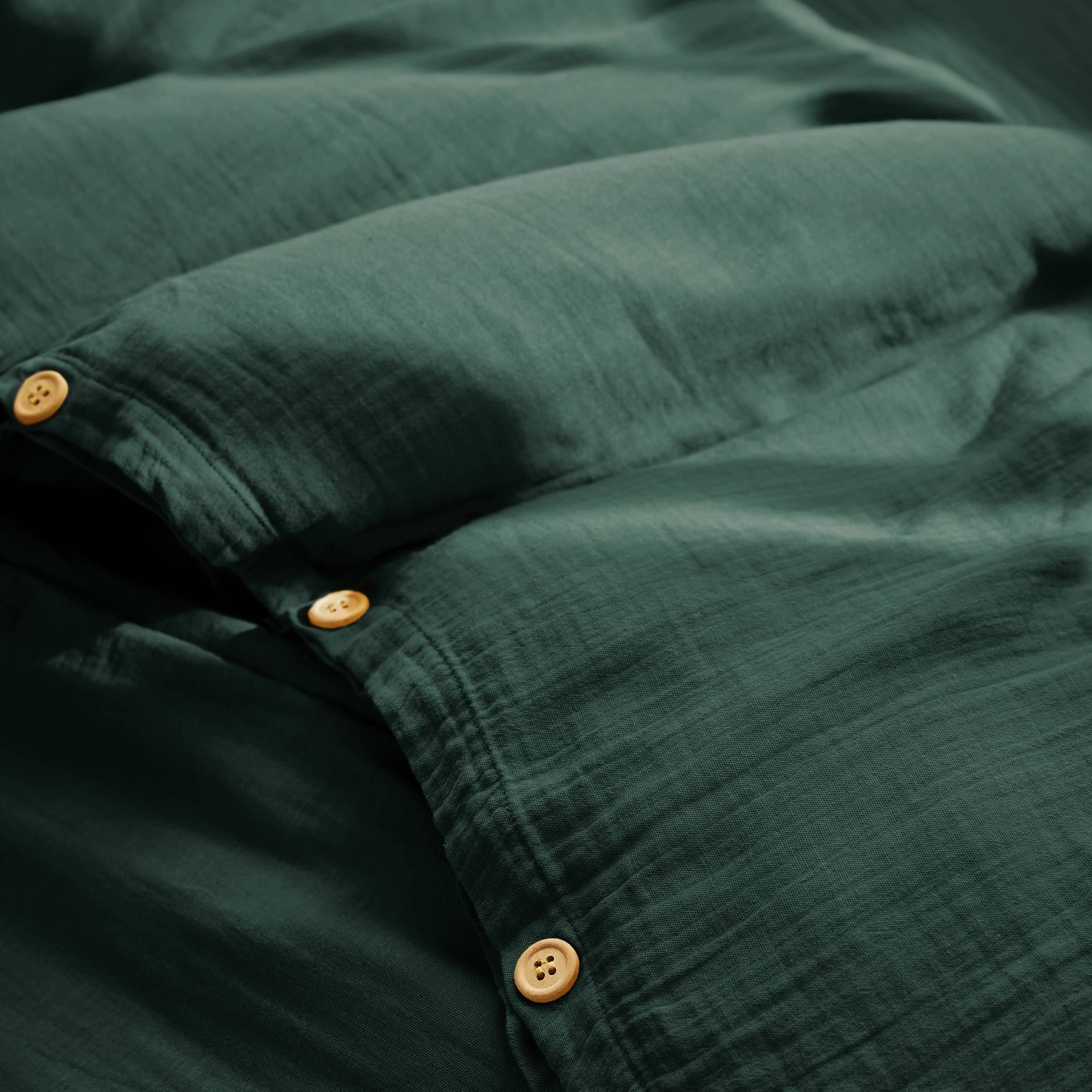 Dieser Gaïa Bettbezug aus Musselin bringt mit seiner Tannengrün-Farbe einen Hauch von Natur in Ihr Schlafzimmer. Sein weicher und leichter Stoff schafft eine beruhigende Atmosphäre für einen erholsamen Schlaf.
