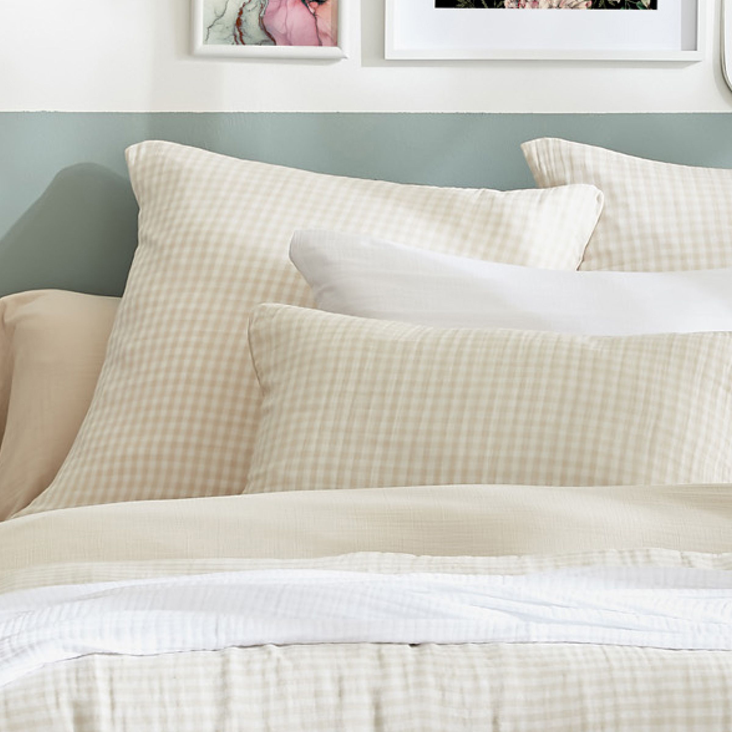 Gönnen Sie sich einen erholsamen Schlaf mit unserem Kissenbezug Gaïa Vichy. Seine unvergleichliche Weichheit und sein elegantes Design mit beige Vichy-Karomustern bringen eine Note von Ruhe in Ihr Schlafzimmer. Aus Musselin gefertigt, verspricht er Ihnen sanfte und komfortable Nächte.