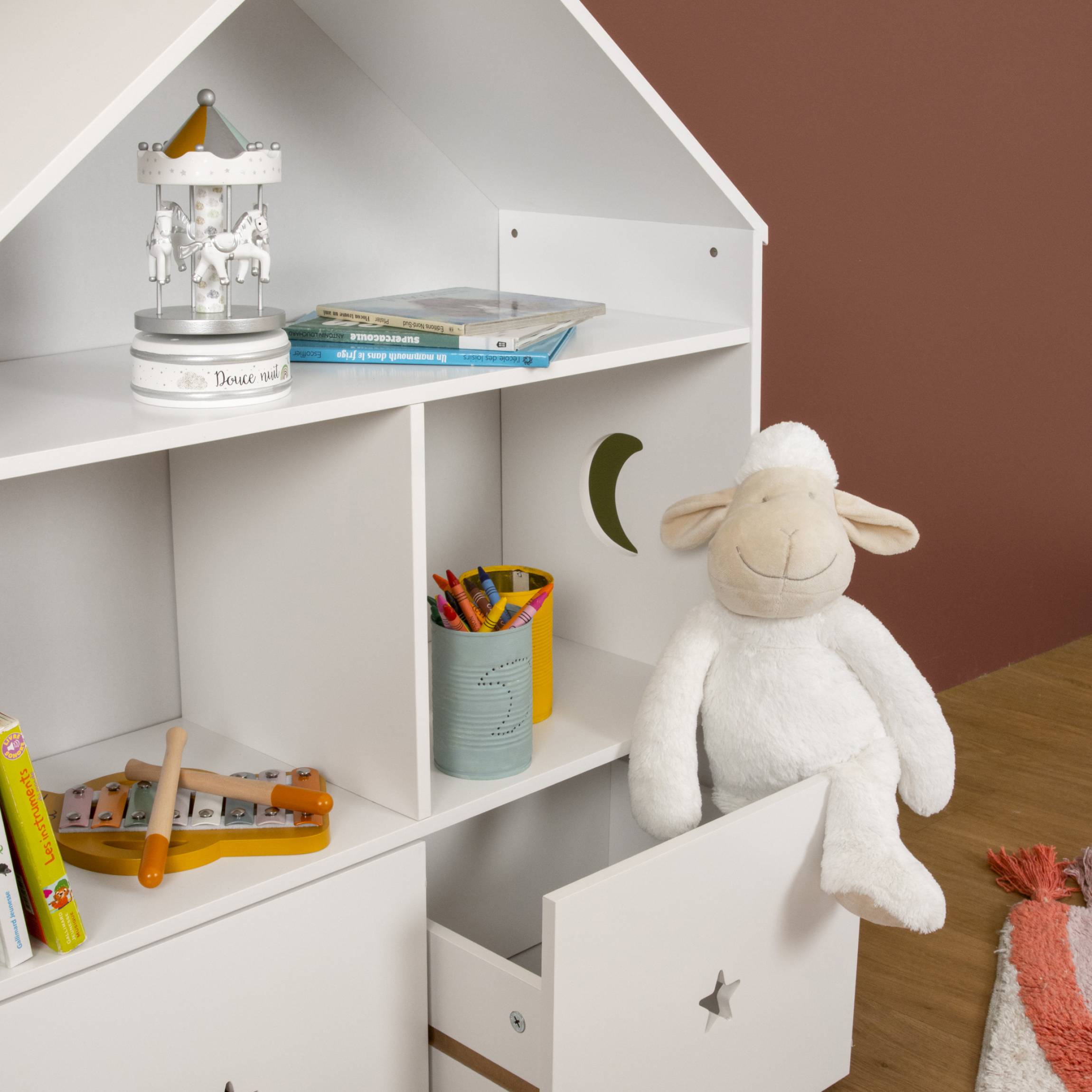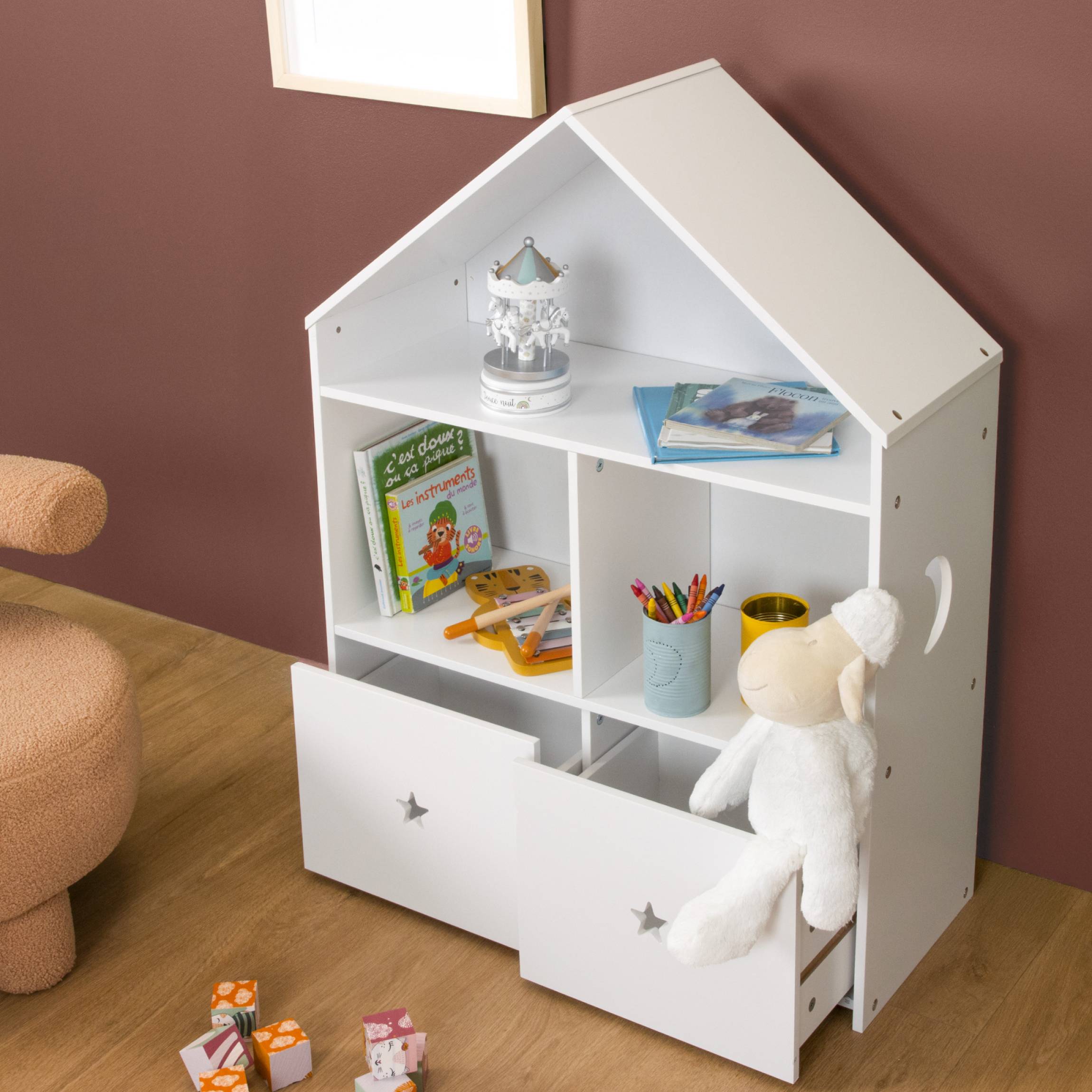 Lassen Sie sich von diesem hübschen kleinen Holzregal aus der Eminza Kids-Kollektion verzaubern. Mit seinen 3 Ebenen und seinen 2 Kisten organisiert und dekoriert es das Zimmer Ihres kleinen Schatzes.